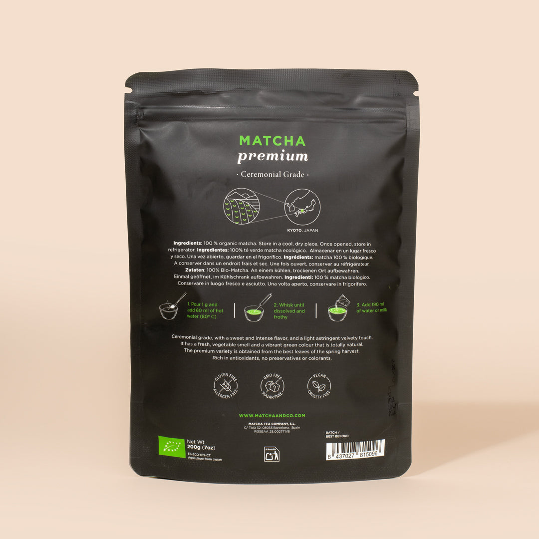 Il tè Matcha Premium contiene caffeina e L-Teanina, ideale da bere al mattino o a mezzogiorno per migliorare concentrazione e prestazioni.
