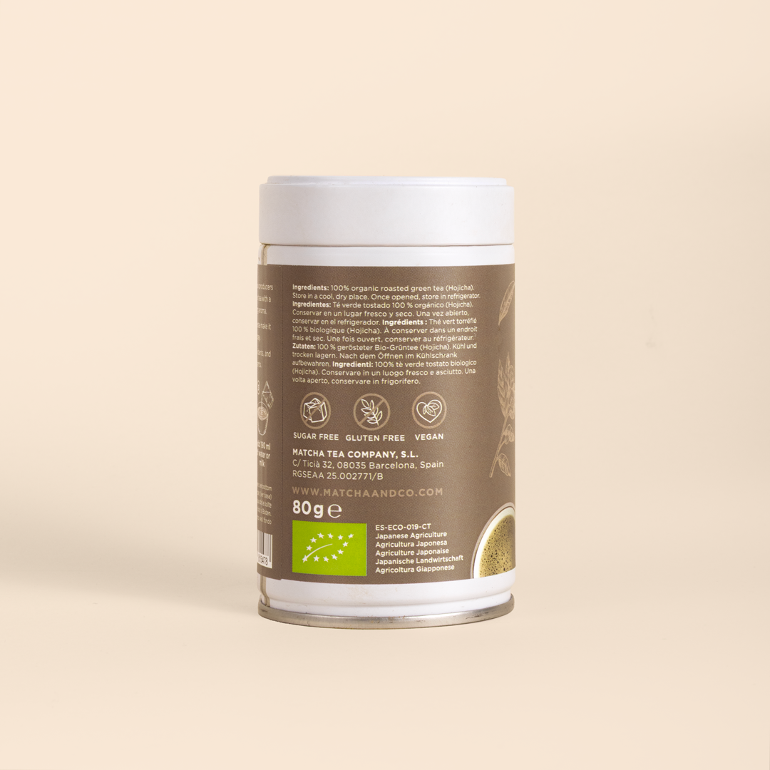 Polvere di tè Hojicha biologico coltivato in Giappone. Realizzato con foglie di tè verde tostate, con basso contenuto di caffeina e un leggero sapore affumicato. Ideale da gustare in qualsiasi momento della giornata.